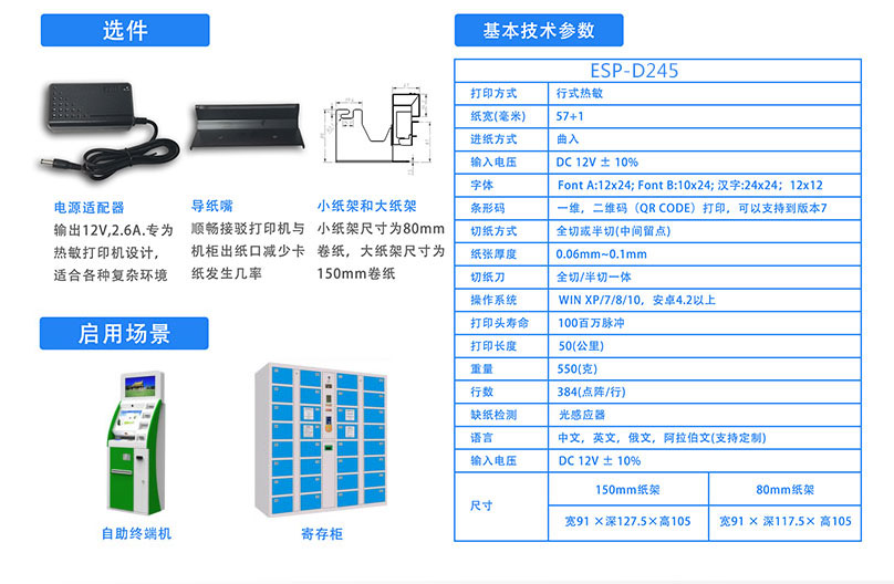 ESP-D245是一款58mm打印寬度的嵌入式熱敏打印機模組,方便集成到自助終端、寄存柜、快遞柜、機器人、人臉識別、取票機等終端機中,提供USB、TTL、RS232三種接口可選,提供接口開發技術支持。